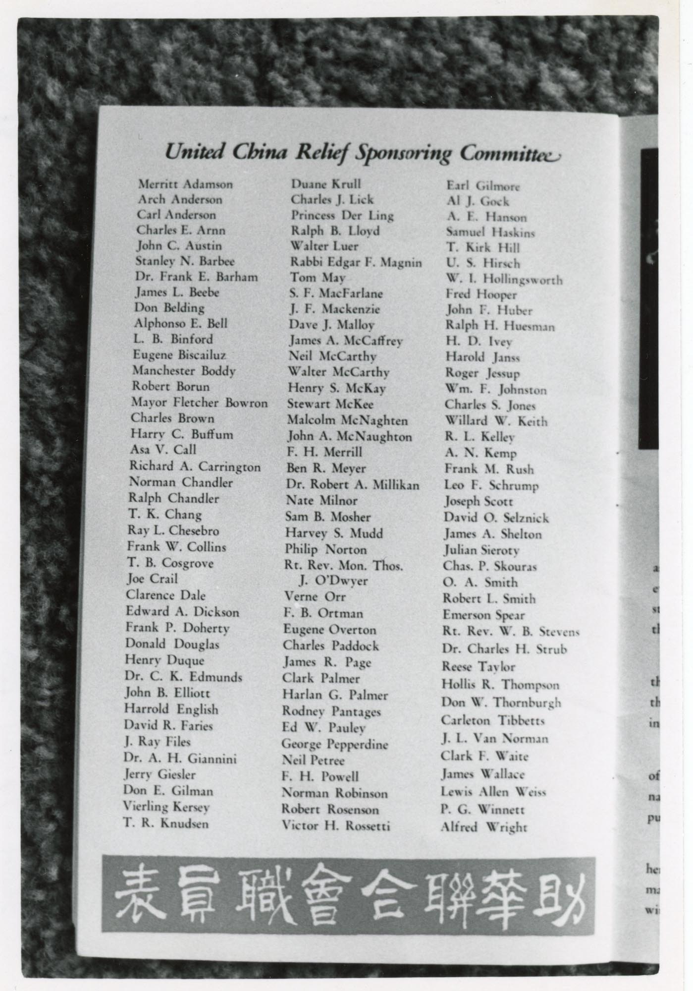 - Page from souvenir program of Moon Festival fundraiser by Chinese Consolidated Benevolent Association for United China Relief, August 7-9, 1941. List of United China Relief sponsors.