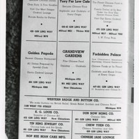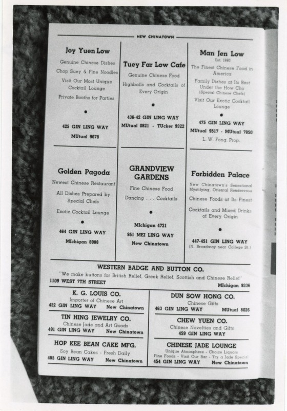 - Page from souvenir program of Moon Festival fundraiser by Chinese Consolidated Benevolent Association for United China Relief, August 7-9, 1941. List of New Chinatown businesses.