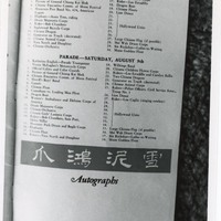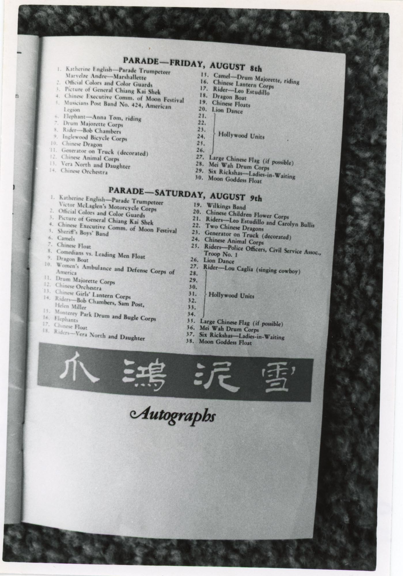 - Page from souvenir program of Moon Festival fundraiser by Chinese Consolidated Benevolent Association for United China Relief, August 7-9, 1941. Parade schedules for August 8 and 9 and space for autographs below.
