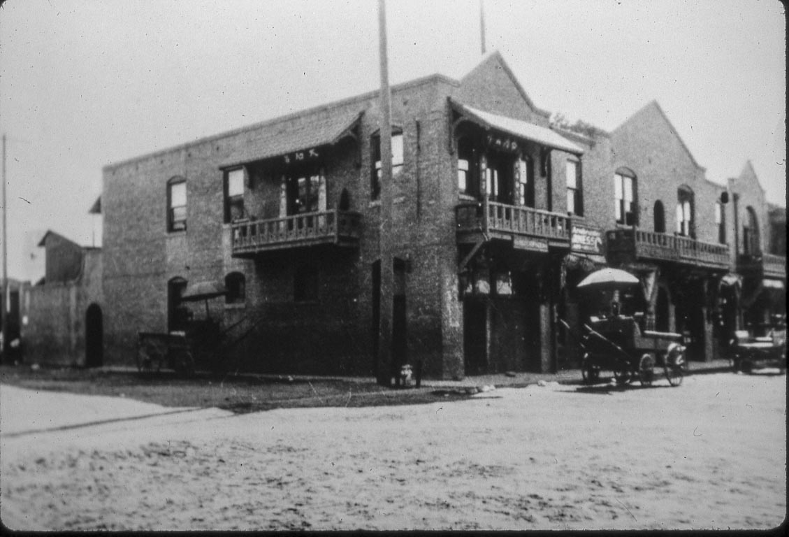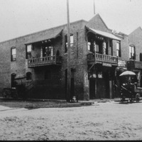 - Two-story brick building with second-story balconies on a street corner. Wagons are parked outside on the street.