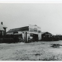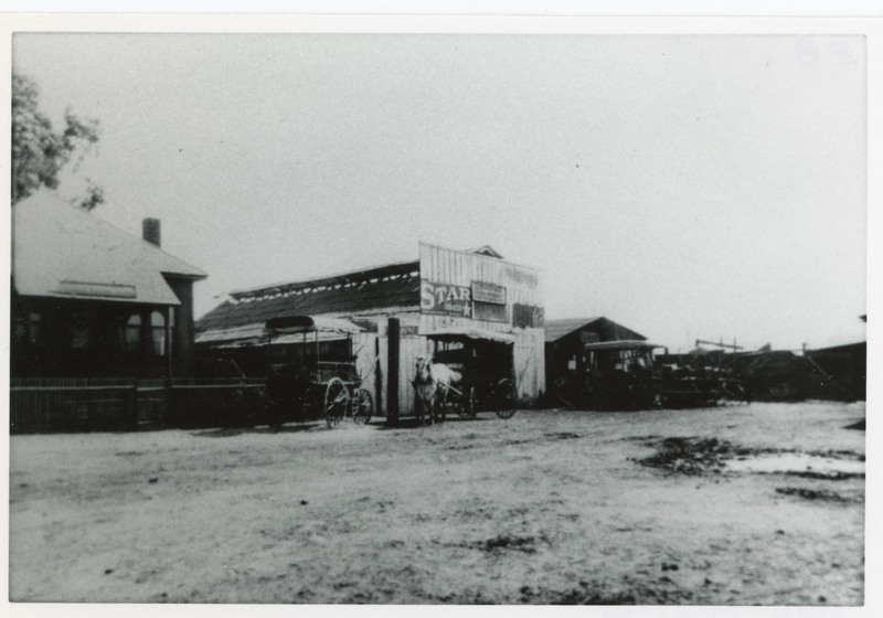- A covered, horse-drawn wagon parked by a building with a "Star Tobacco" sign over the entrance. Another covered wagon is parked on the street.