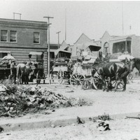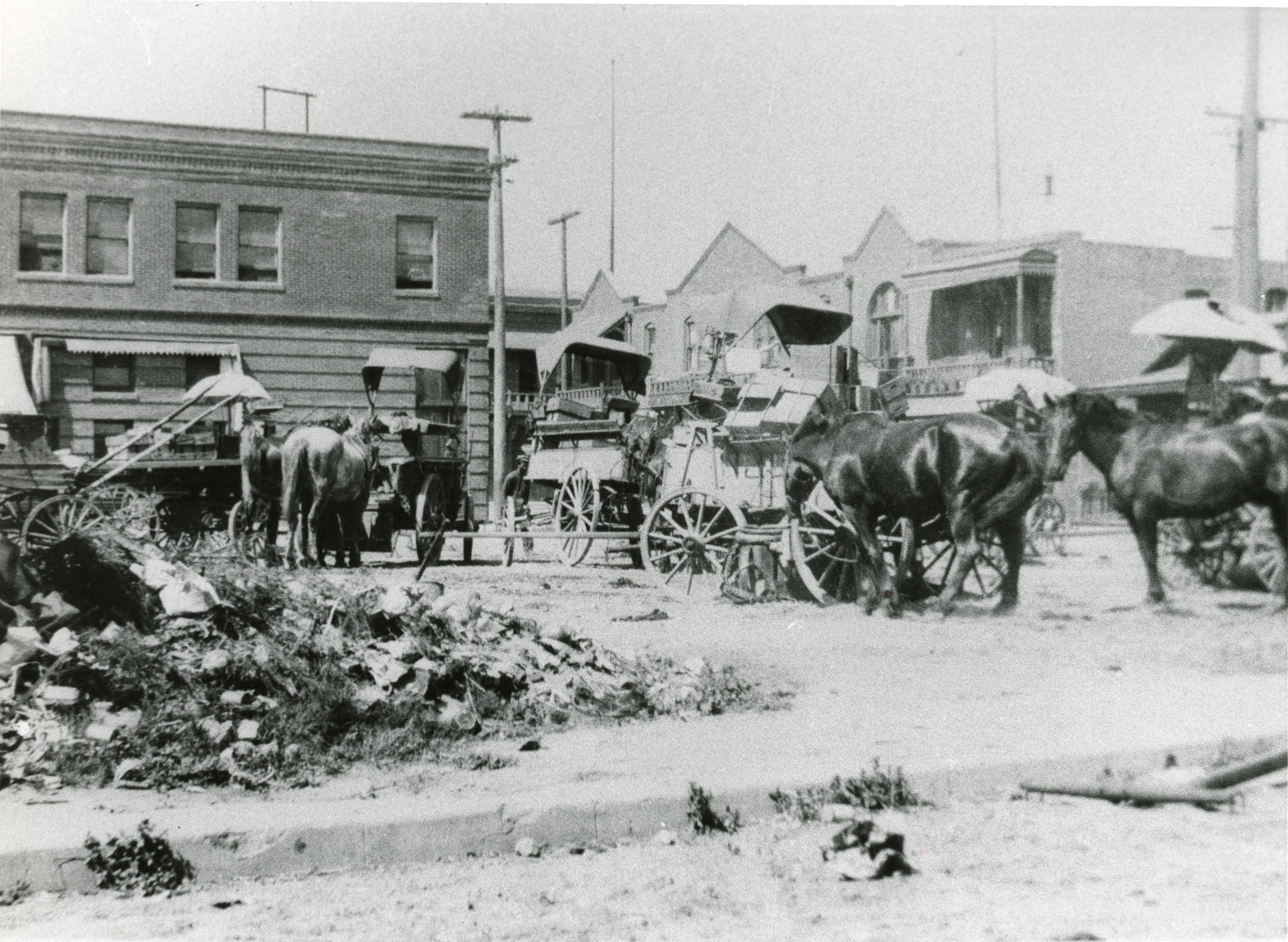 - Several wagons and horses stand along the street. There are brick buildings with second-story balconies and first-story awnings in the background along with several utility poles. There is a pile of rubble in the foreground.