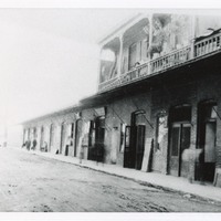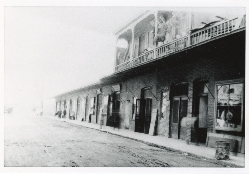 - View of dirt road and brick buildings on the south side of Marchessault Street east of Alameda Street. The building in the foreground is two stories, with flowers and plants on the balcony. The building in the background is one story with pedestrians walking in front of it.