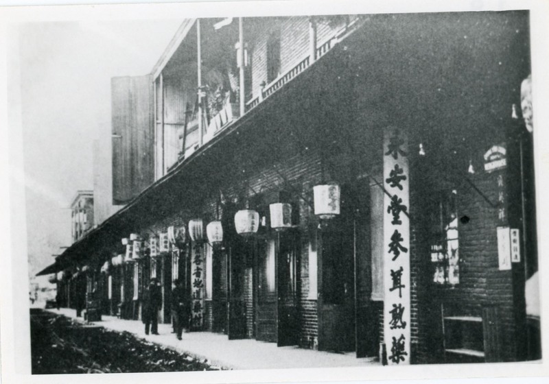 Storefronts along Marchessault Street including Quong Ying Chong Merchandise at 300 1/2. There are lanterns and signs in Chinese in front of the stores and pedestrians are walking down the sidewalks.