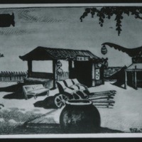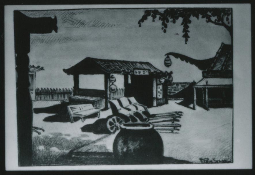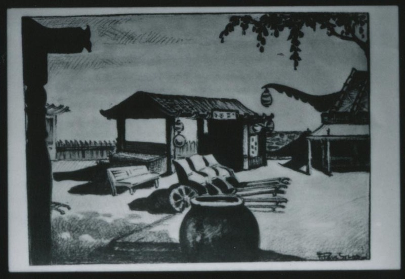 - Illustration of a court and buildings from "China City" by Raymond Connor, illustrated by F. Paul (Lyles?), copyright 1938 George S. Stein, published by China City Publishing Co. Los Angeles, Calif.