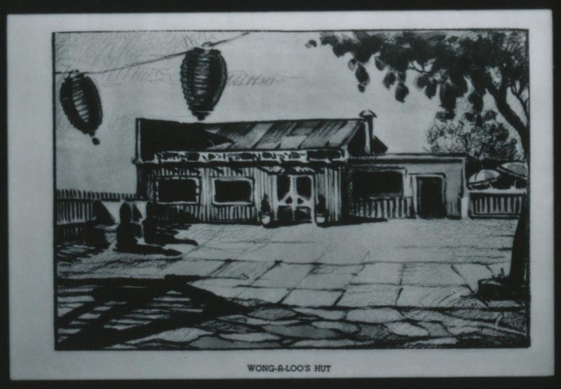 - Illustration of Wong-A-Loo's Hut from "China City" by Raymond Connor, illustrated by F. Paul (Lyles?), copyright 1938 George S. Stein, published by China City Publishing Co. Los Angeles, Calif.