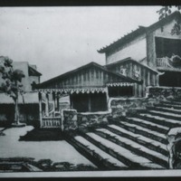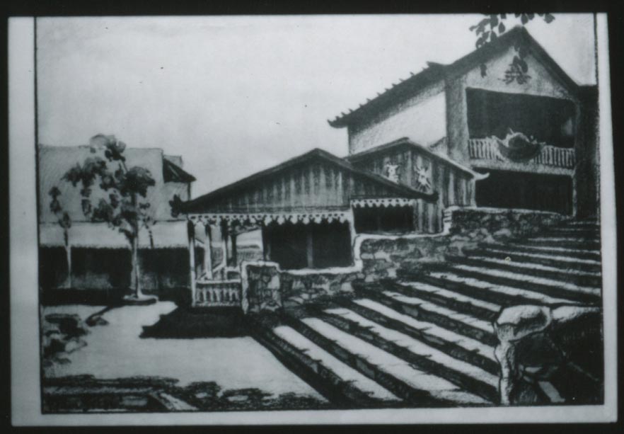 - Illustration of a stairway and buildings from "China City" by Raymond Connor, illustrated by F. Paul (Lyles?), copyright 1938 George S. Stein, published by China City Publishing Co. Los Angeles, Calif.