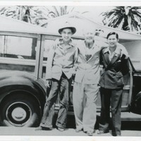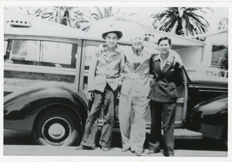 - Standing in front of a station wagon from left to right: unnamed friend, Tom Gubbins, and Swan Yee.