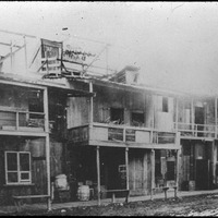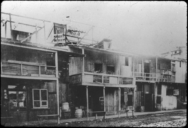 - A row of wooden two-story buildings in Old Chinatown. Salted fish are hung up to dry on the rooftops.