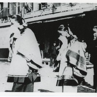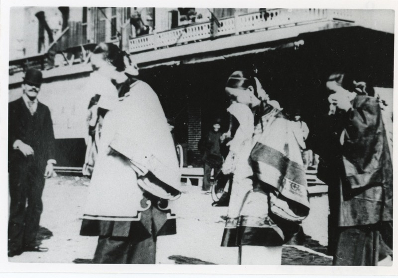 - Three women in traditional clothing with men in the background at a funeral. Photo taken possibly in the early 1900s.