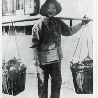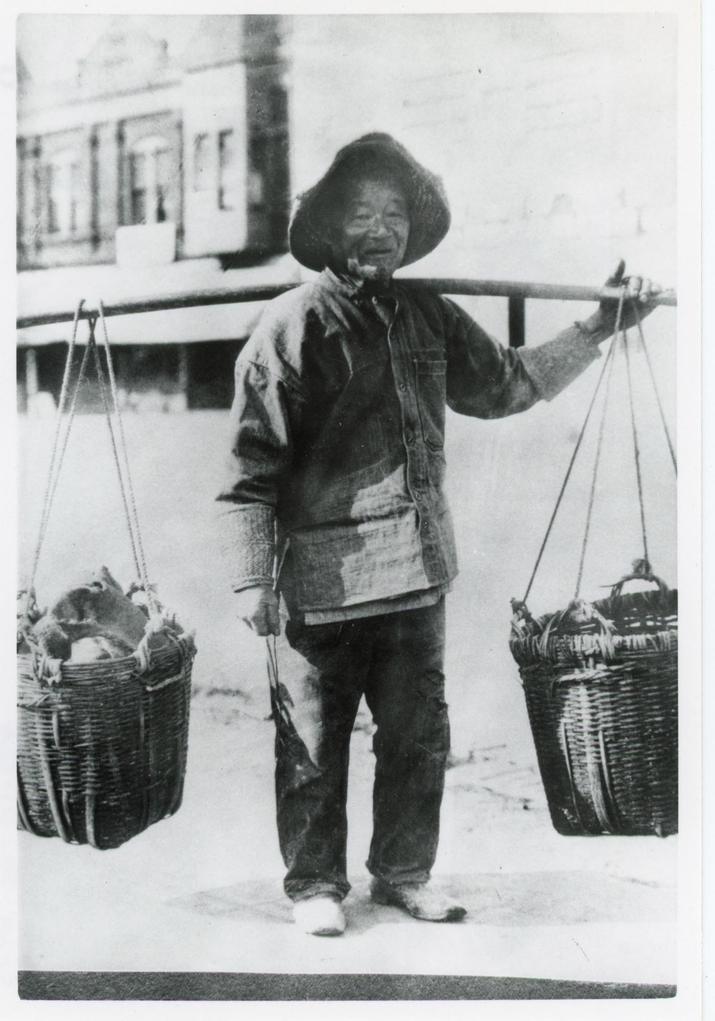 - A vegetable peddler stands carrying two baskets on a pole.