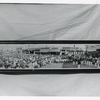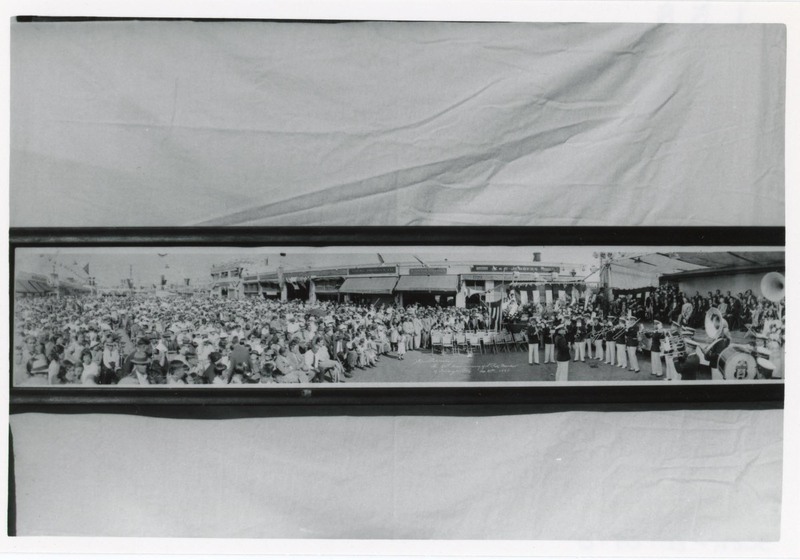 - A panoramic photograph of a band playing for the 25th Anniversary of the 9th Street City Market. The band plays in front of a stage and faces a large crowd of spectators, all of which is set in the street. The 9th Street City Market was started in 1909 by Mr. Louis Quan. Ella Quon and Kit Quon are in the photograph.