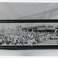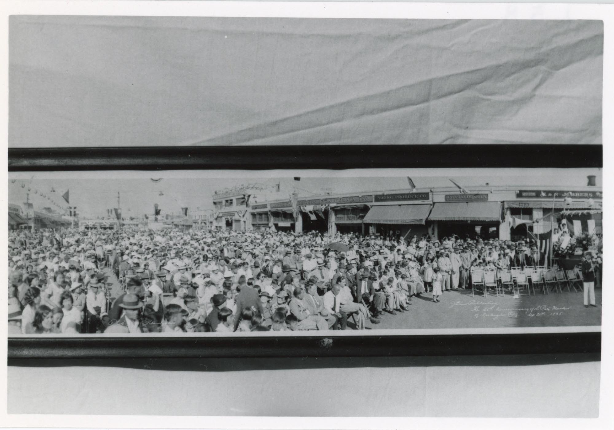 - A detail shot of a panoramic photograph from the 25th Anniversary of the 9th Street City Market. A large crowd of spectators is seated in the street. The 9th Street City Market was started in 1909 by Mr. Louis Quan. Ella Quon and Kit Quon are in the photograph.