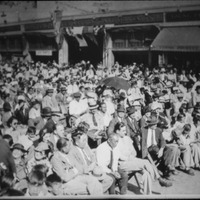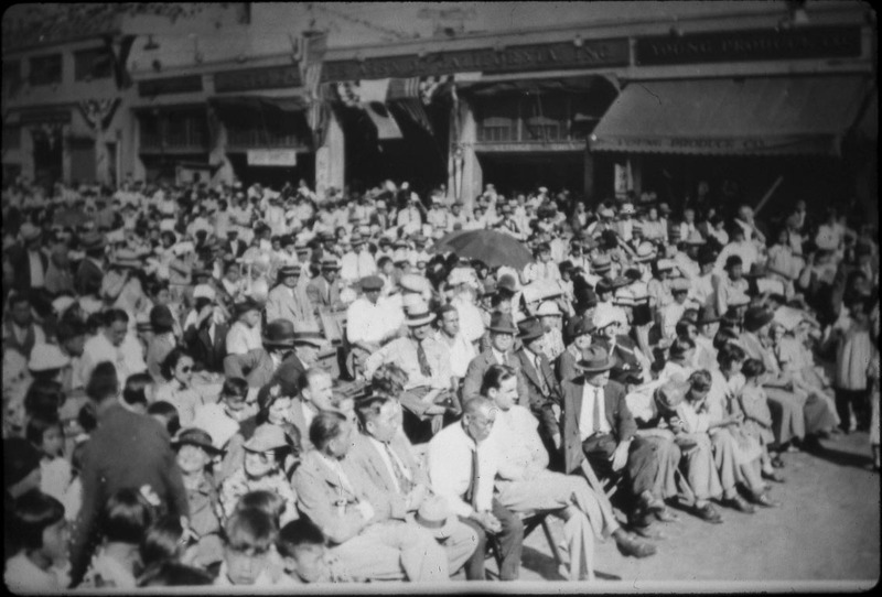 - A detail shot of a panoramic photograph from the 25th Anniversary of the 9th Street City Market. A large crowd of spectators is seated in the street. The 9th Street City Market was started in 1909 by Mr. Louis Quan. Ella Quon and Kit Quon are in the photograph.