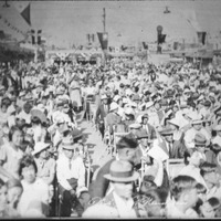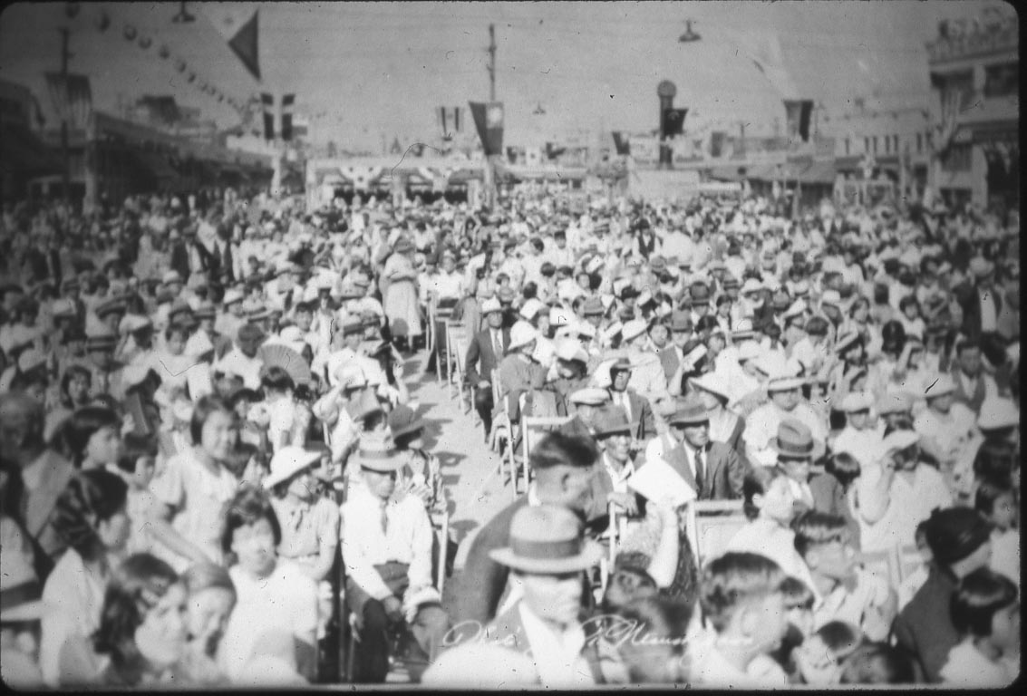 - A detail shot of a panoramic photograph from the 25th Anniversary of the 9th Street City Market. A large crowd of spectators is seated in the street. Several large flags are flying over top of the crowd in the background. The 9th Street City Market was started in 1909 by Mr. Louis Quan. Ella Quon and Kit Quon are in the photograph.
