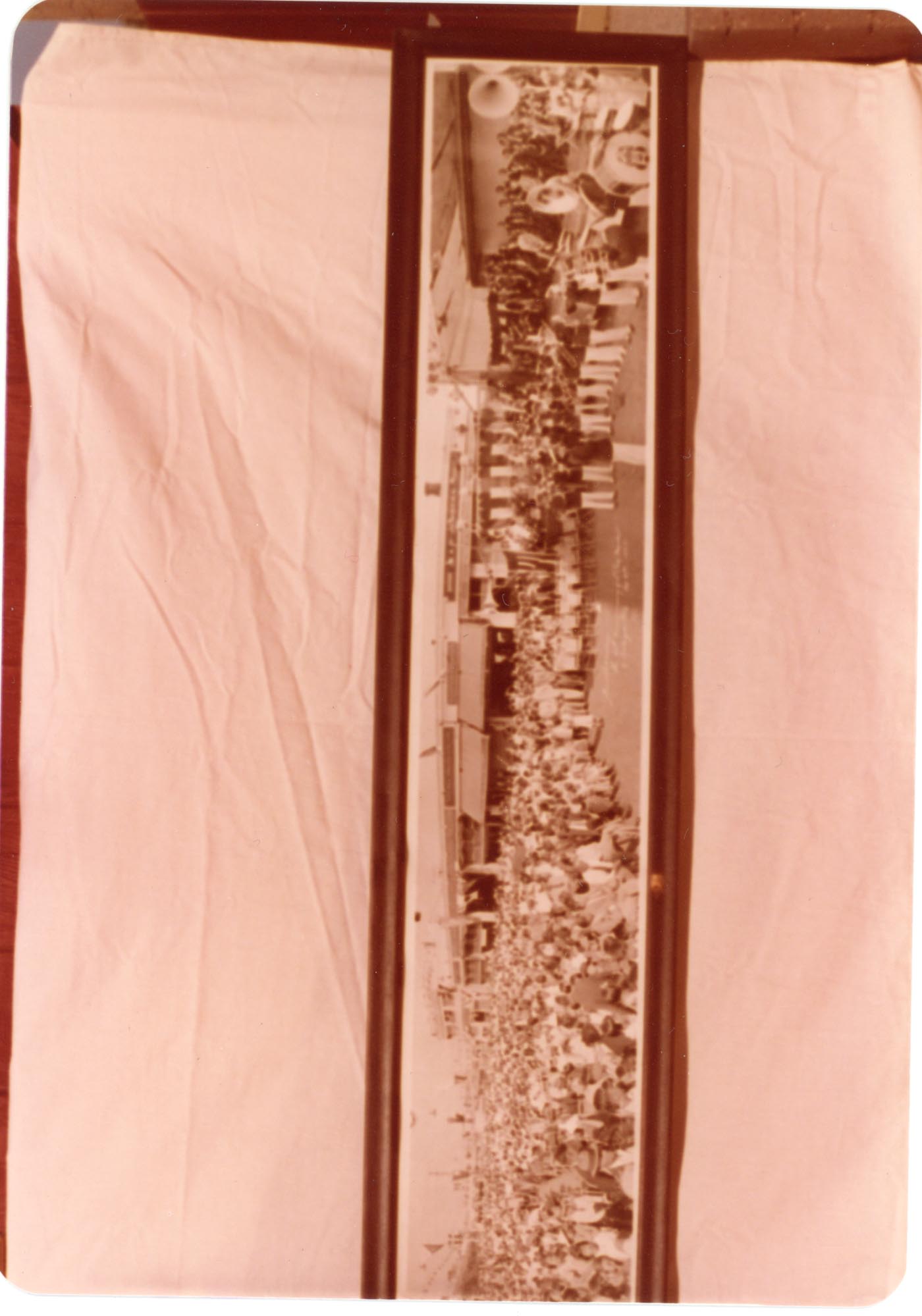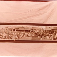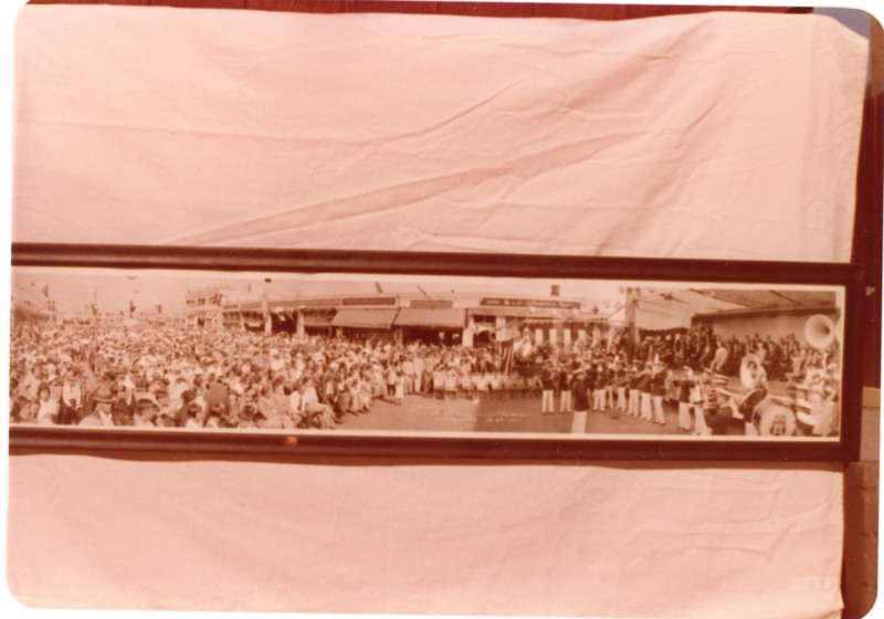 - A panoramic photograph of a band playing for the 25th Anniversary of the 9th Street City Market. The band plays in front of a stage and faces a large crowd of spectators, all of which is set in the street. This image is sepia toned. The 9th Street City Market was started in 1909 by Mr. Louis Quan. Ella Quon and Kit Quon are in the photograph.