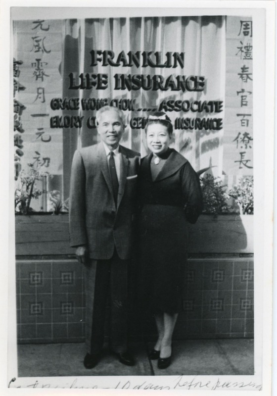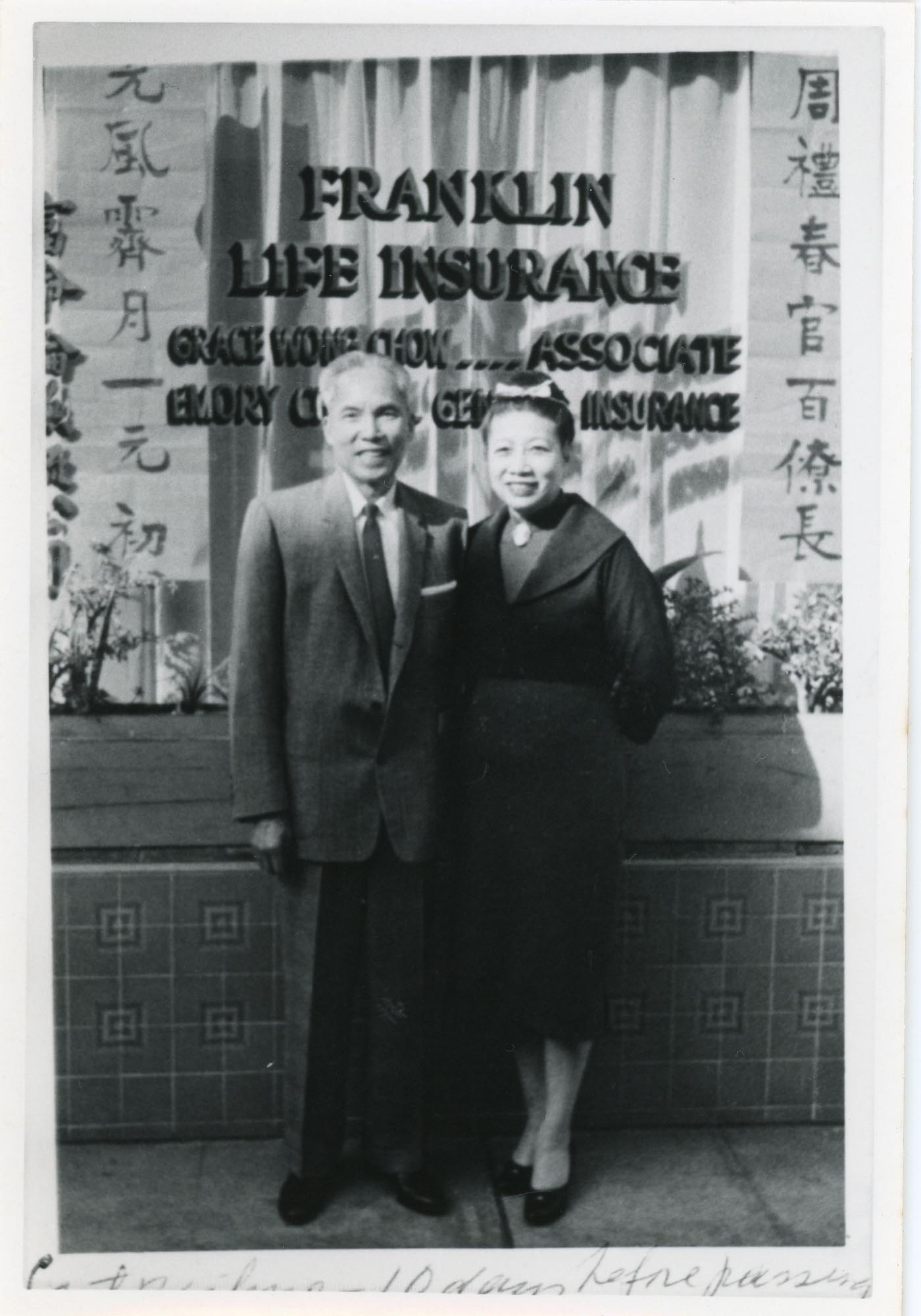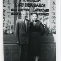 - Grace Chow and Emory Chow in front of office (Franklin Life Insurance), color