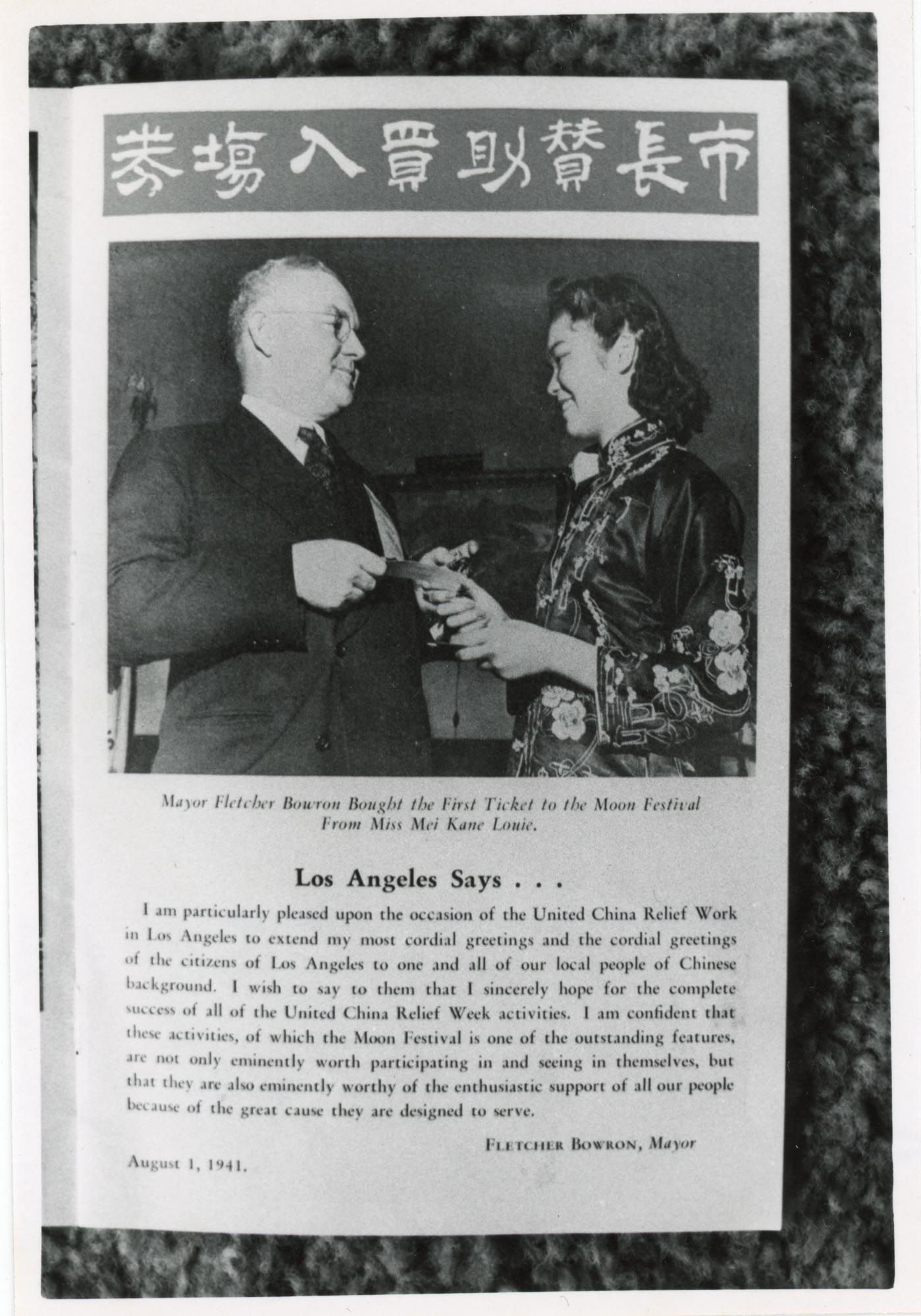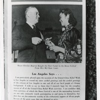 - Page from souvenir program of Moon Festival fundraiser by Chinese Consolidated Benevolent Association for United China Relief, August 7-9, 1941. Photo of Mayor Fletcher Bowron buying the first ticket from Mei Kane Louie accompanied by a short passage written by him.