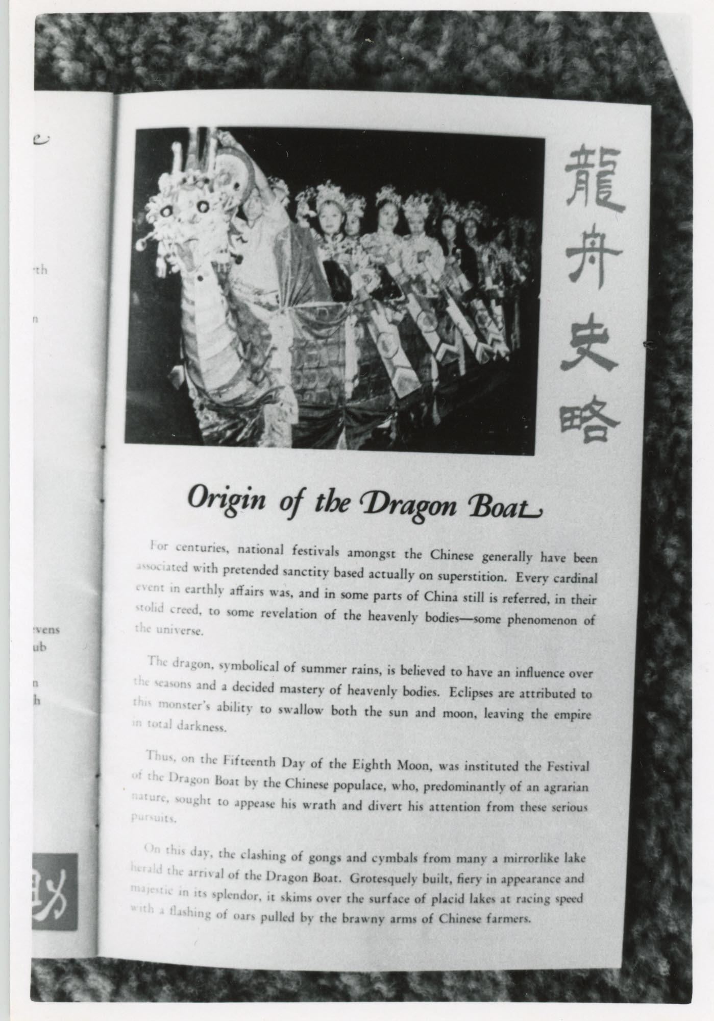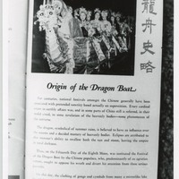 - Page from souvenir program of Moon Festival fundraiser by Chinese Consolidated Benevolent Association for United China Relief, August 7-9, 1941. Photo of women on a dragon boat accompanied by article.