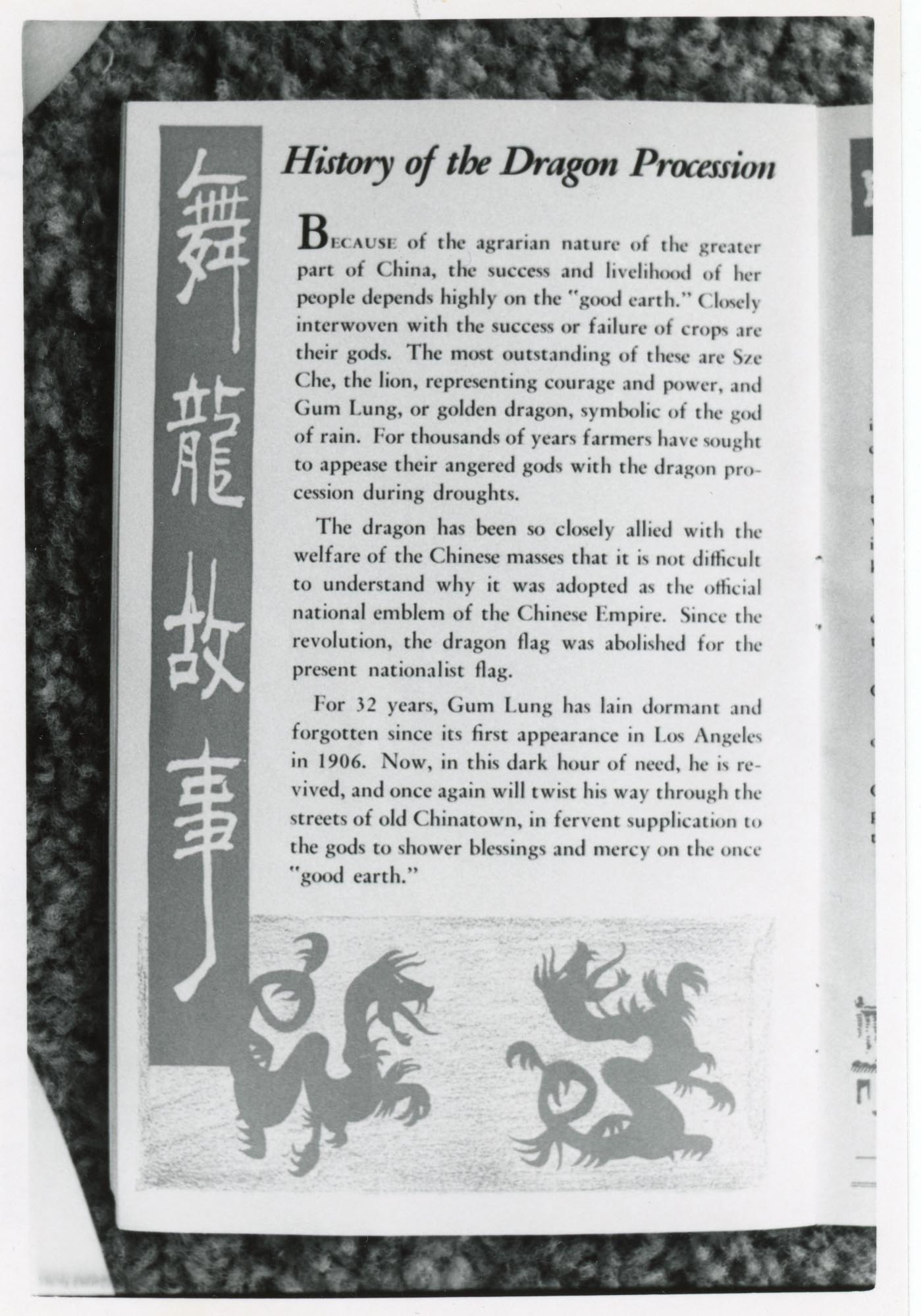 - Page from souvenir program of Moon Festival fundraiser by Chinese Consolidated Benevolent Association for United China Relief, August 7-9, 1941. Article about dragon parades.
