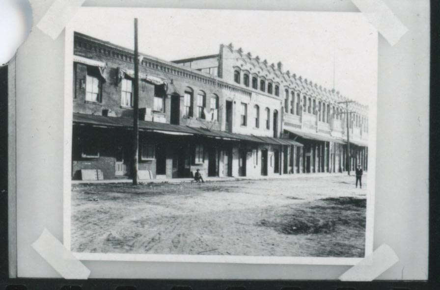 "Los Angeles Street runs north and south". Left to right: Sam Sing butcher shop, General Merchandise Co., A Los Clultos Espanoles