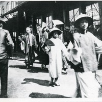 - Men and boys holding fans and wearing traditional clothing walking past a pool hall on the 400 block on the east side of North Los Angeles Street.